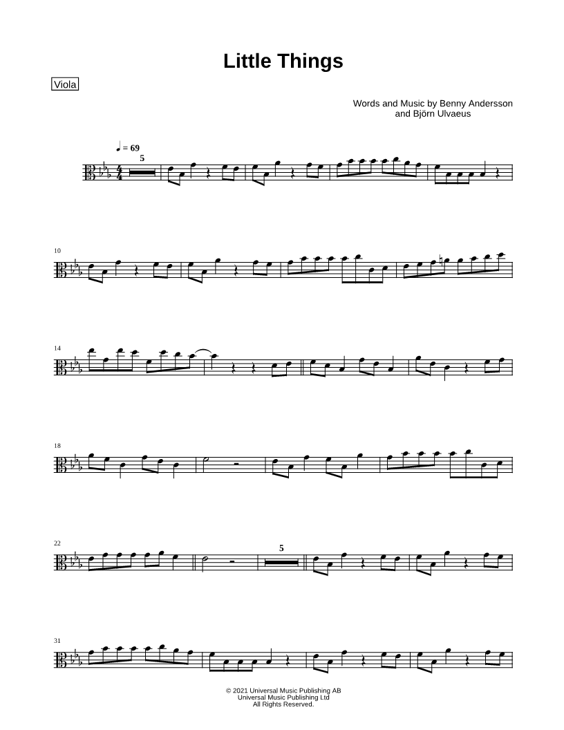 1. Little Things - Viola (click here to preview and play this piece) Performer: Composers: Lyricists: Scored For:Instrumental Solo and Instrumental Part Instrument:Viola, range: Bb3-G5 Number of pages:2 Click here to purchase this piece separately for $4.99 |
