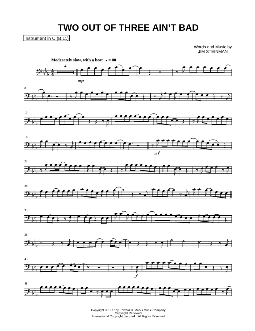 1. Two Out of Three Ain't Bad - Bass Clef Instrument (click here to preview and play this piece) Performer: Composer: Lyricist: Scored For:Instrumental Solo and Instrumental Part Instruments:Bass Clef Instrument, Double Bass, Cello, Baritone Horn, Trombone and Bassoon Number of pages:2 Click here to purchase this piece separately for $4.99 |
