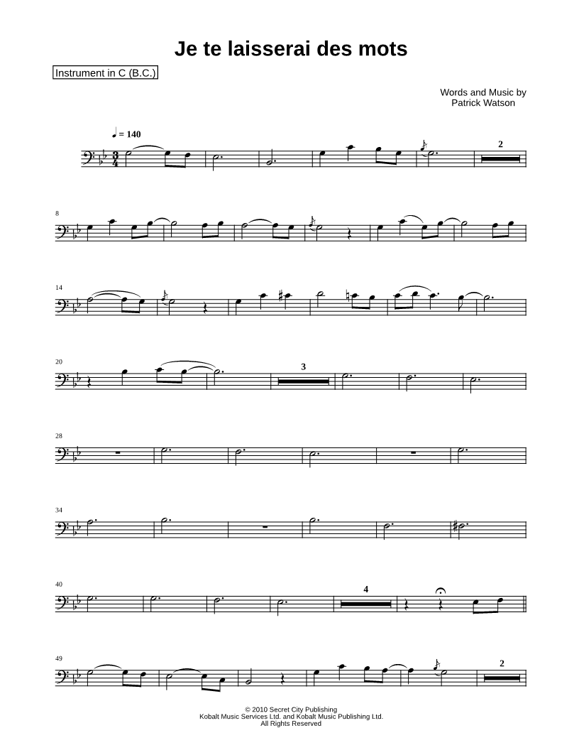 1. Je te laisserai des mots - Bass Clef Instrument (click here to preview and play this piece) Performer: Composer: Lyricist: Scored For:Instrumental Solo and Instrumental Part Instruments:Bass Clef Instrument, Baritone Horn, Bassoon, Trombone, Cello and Double Bass Number of pages:2 Click here to purchase this piece separately for $4.99 |