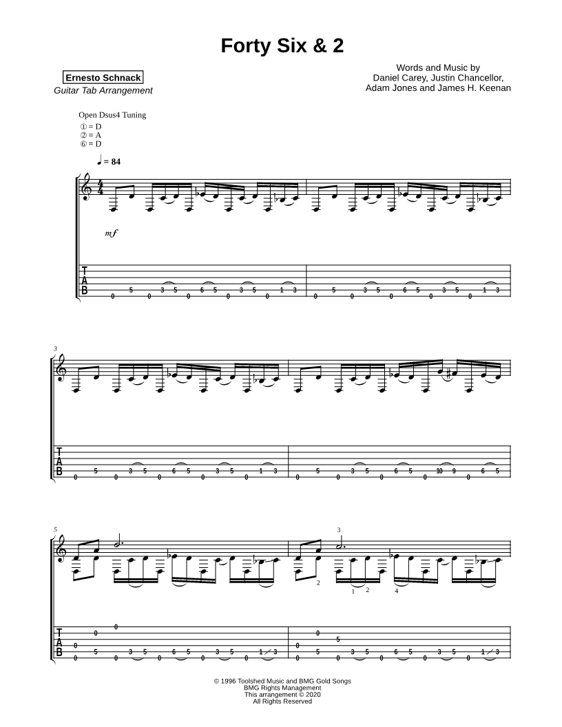 1. Forty Six & 2 (click here to preview and play this piece) Performers: Ernesto Schnack and Tool Composers: Lyricists: Scored For:Guitar TAB and Instrumental Solo Instrument:Guitar Number of pages:13 Click here to purchase this piece separately for $5.99 |