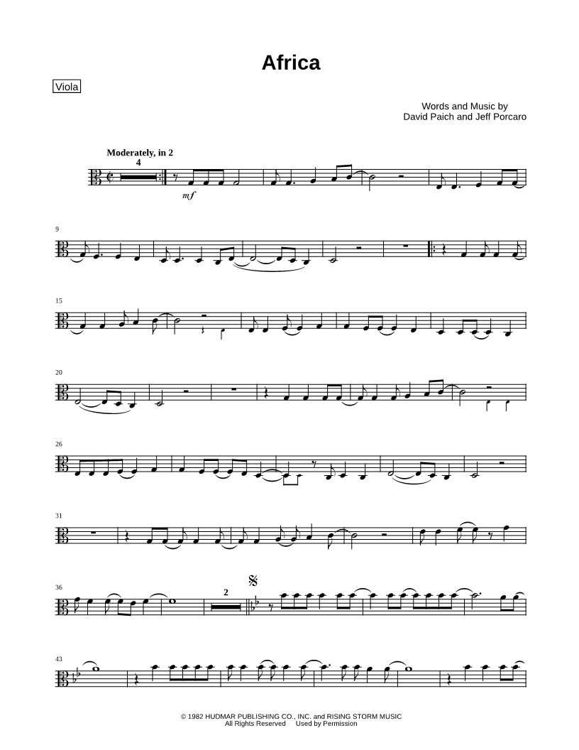 1. Africa - Viola (click here to preview and play this piece) Performer: Composers: Lyricists: Scored For:Instrumental Solo and Instrumental Part Instrument:Viola, range: C3-E5 Number of pages:2 Click here to purchase this piece separately for $4.99 |