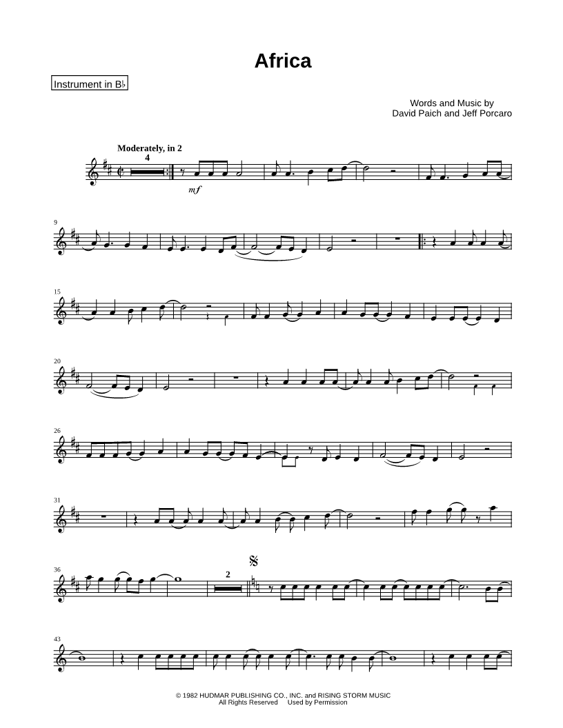 1. Africa - Bb Instrument (click here to preview and play this piece) Performer: Composers: Lyricists: Scored For:Instrumental Solo and Instrumental Part Instruments:Bb Instrument, range: D4-F#6, Tenor Saxophone, Soprano Saxophone, Trumpet and Clarinet Number of pages:2 Click here to purchase this piece separately for $4.99 |