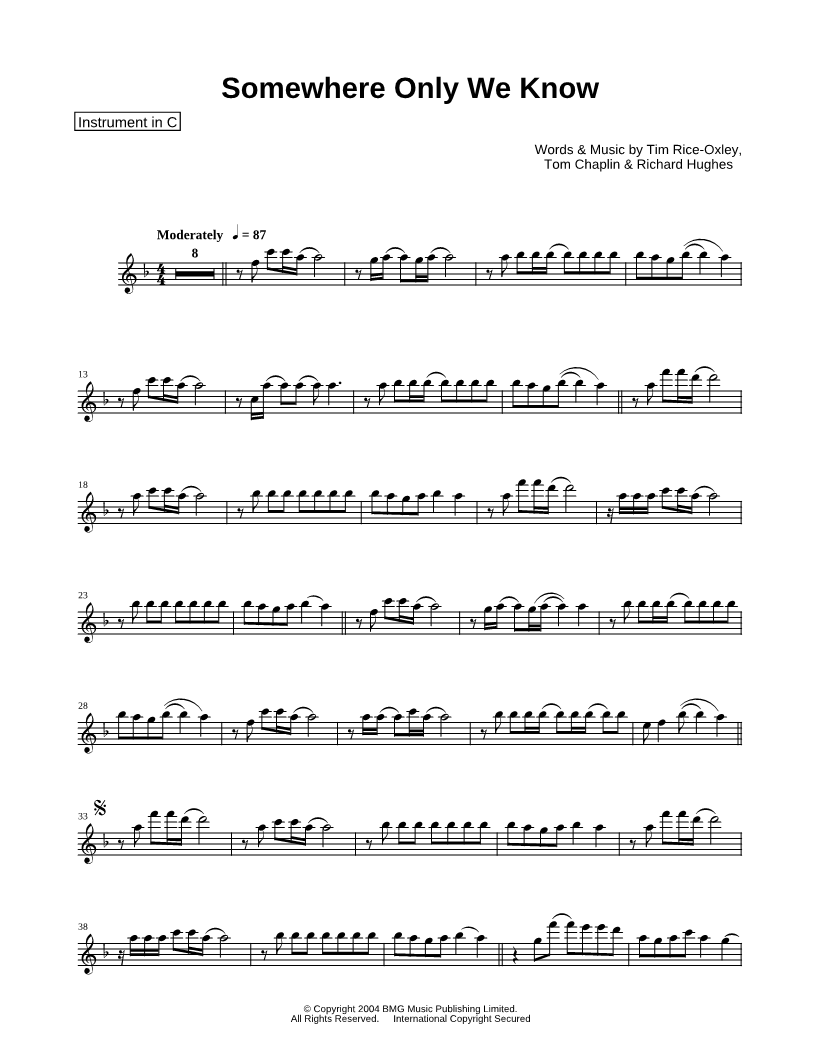 1. Somewhere Only We Know - C Instrument (click here to preview and play this piece) Performer: Composers: Lyricists: Scored For:Instrumental Solo and Instrumental Part Instruments:C Instrument, range: C5-F6, Flute, Oboe, Violin and Recorder Number of pages:2 Click here to purchase this piece separately for $4.99 |