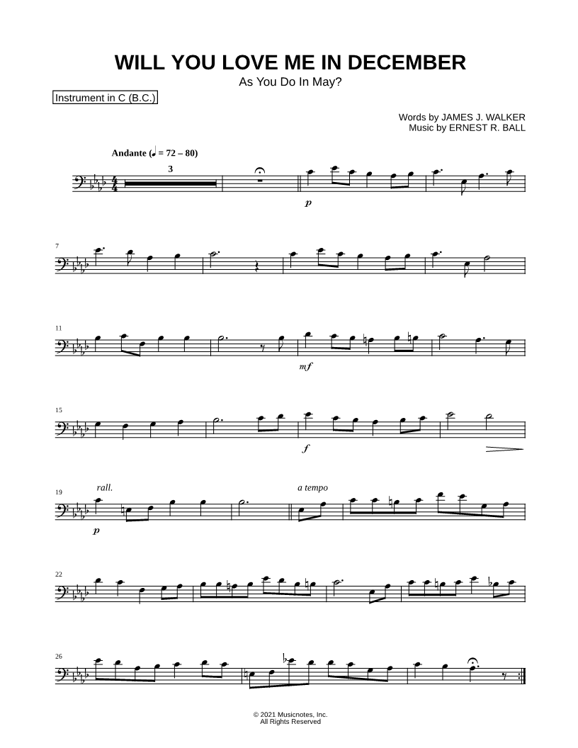 1. Will You Love Me In December - Bass Clef Instrument (click here to preview and play this piece) Composer: Lyricist: Scored For:Instrumental Solo Instruments:Bass Clef Instrument, Baritone Horn, Bassoon, Trombone, Cello and Double Bass Number of pages:1 Click here to purchase this piece separately for $4.99 |