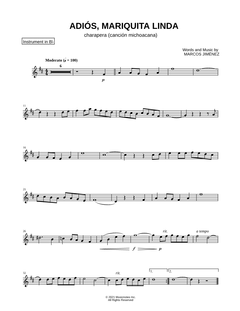 1. Adios, Mariquita Linda - Bb Instrument (click here to preview and play this piece) Composer: Lyricist: Scored For:Instrumental Solo and Instrumental Part Instruments:Bb Instrument, range: D4-A5, Tenor Saxophone, Trumpet, Soprano Saxophone and Clarinet Number of pages:1 Click here to purchase this piece separately for $4.99 |