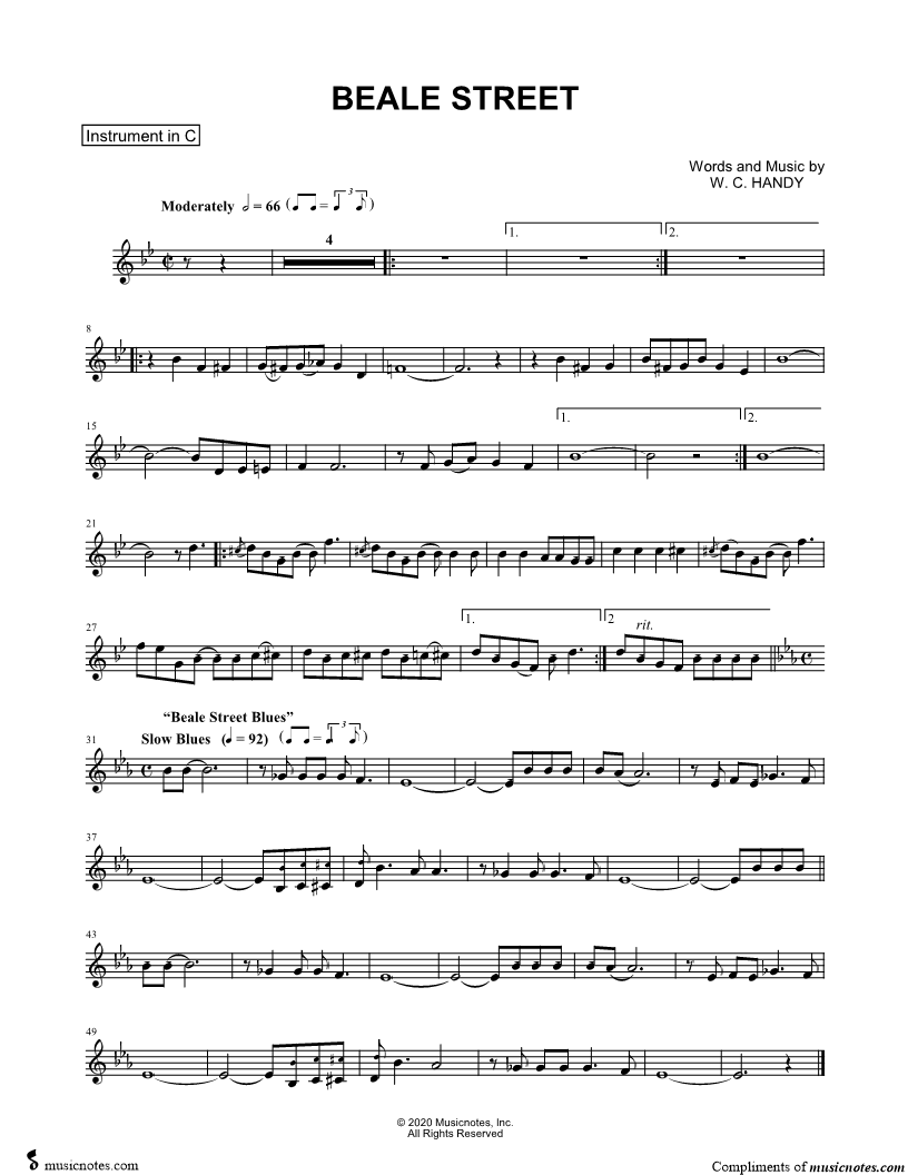 1. Beale Street Blues - C Instrument (click here to preview and play this piece) Composer: Lyricist: Scored For:Instrumental Solo and Instrumental Part Instruments:C Instrument, range: Bb3-F5, Recorder, Violin, Oboe and Flute Number of pages:1 Click here to purchase this piece separately for $4.99 |