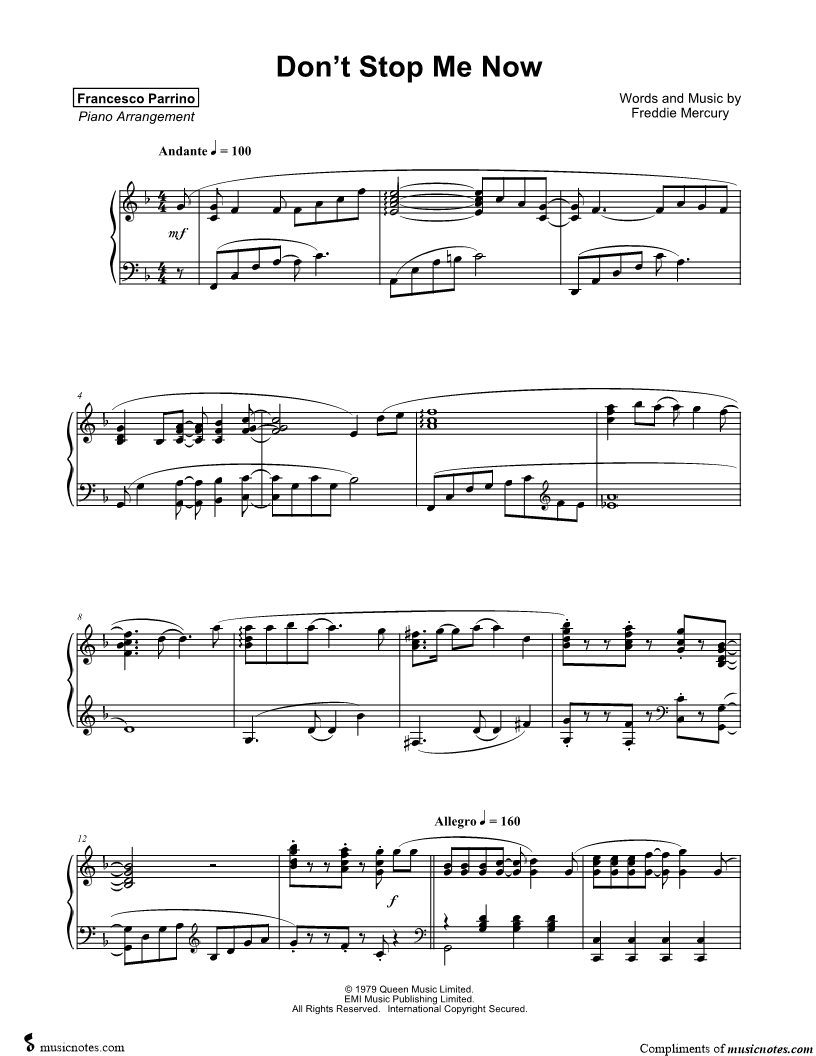 1. Don't Stop Me Now (click here to preview and play this piece) Performers: Composer: Lyricist: Scored For:Instrumental Solo Instrument:Piano Number of pages:7 Click here to purchase this piece separately for $9.99 |