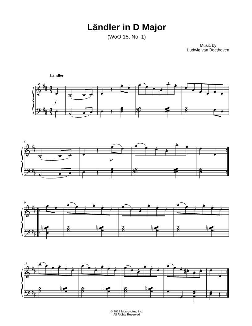 1. Ländler in D Major, WoO 15, No. 1 (click here to preview and play this piece) Composer: Scored For:Instrumental Solo Instrument:Piano Number of pages:1 Click here to purchase this piece separately for $5.99 |