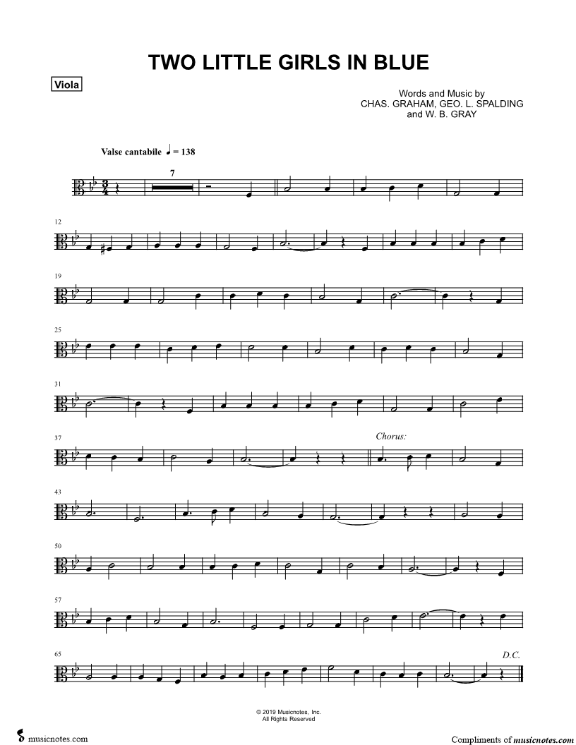 1. Two Little Girls in Blue - Viola (click here to preview and play this piece) Composers: Lyricists: Scored For:Instrumental Part and Instrumental Solo Instrument:Viola, range: F3-F4 Number of pages:1 Click here to purchase this piece separately for $4.99 |