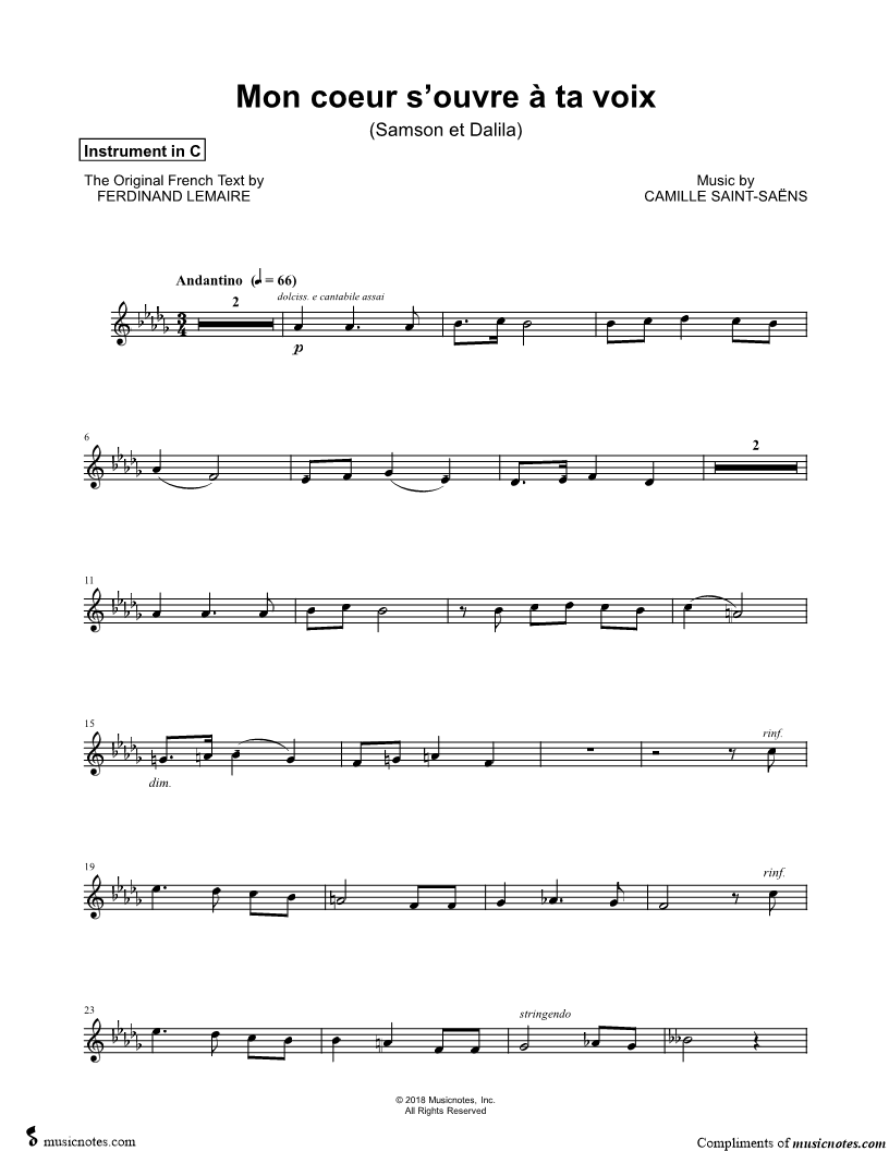 1. Mon coeur s'ouvre à ta voix - C Instrument (click here to preview and play this piece) Composer: Lyricist: Scored For:Instrumental Solo and Instrumental Part Instruments:C Instrument, range: Bb3-Gb5, Flute, Violin, Oboe and Recorder Number of pages:3 Click here to purchase this piece separately for $4.99 |