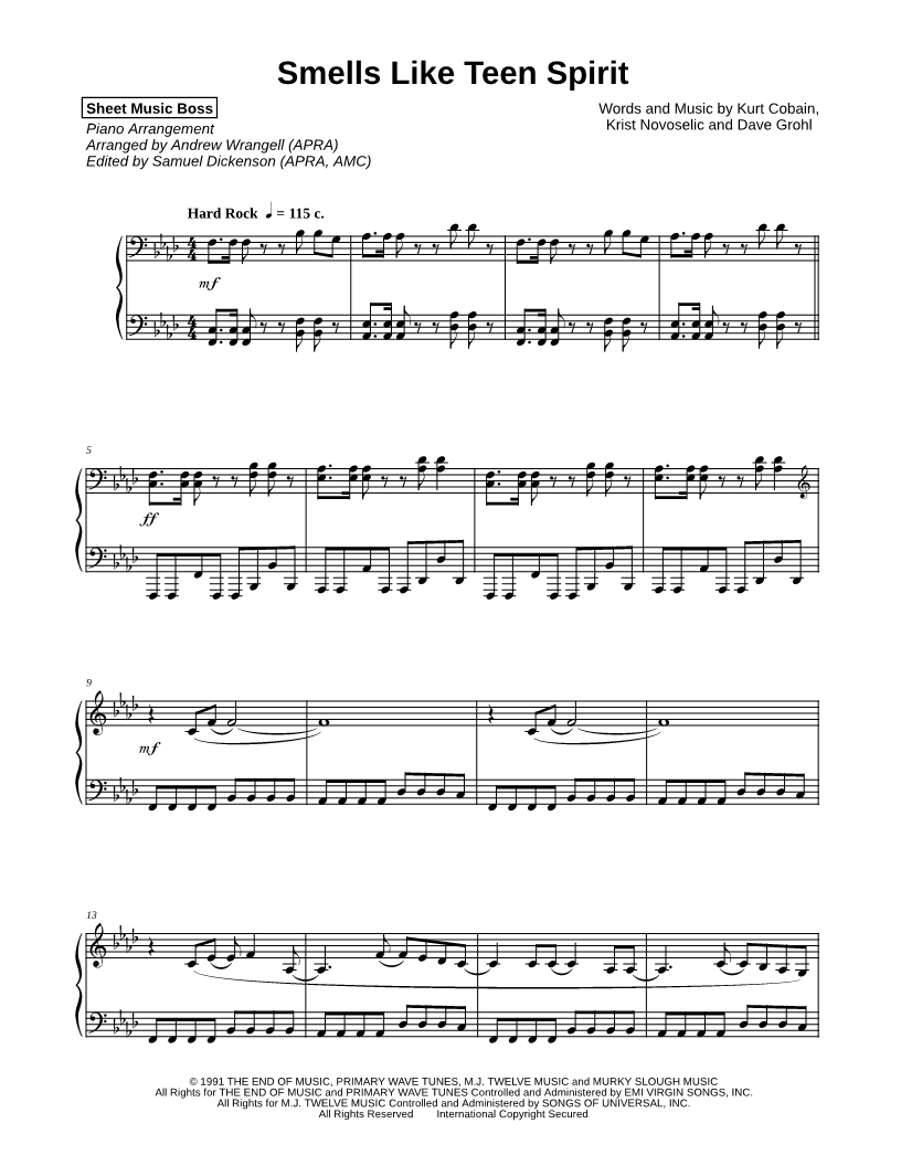 1. Smells Like Teen Spirit (click here to preview and play this piece) Performers: Composers: Lyricists: Scored For:Instrumental Solo Instrument:Piano Number of pages:7 Click here to purchase this piece separately for $9.99 |