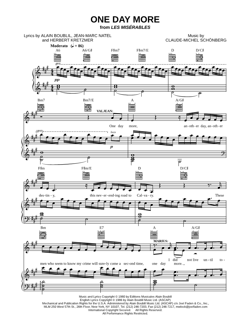 1. One Day More (click here to preview and play this piece) Composer: Lyricists: Scored For:Piano/Vocal/Guitar Instruments:Voice 1, range: A3-A5, Piano, Guitar, Voice 2, Voice 3, Voice 4, Voice 5 and Voice 6 Number of pages:10 Click here to purchase this piece separately for $5.99 |