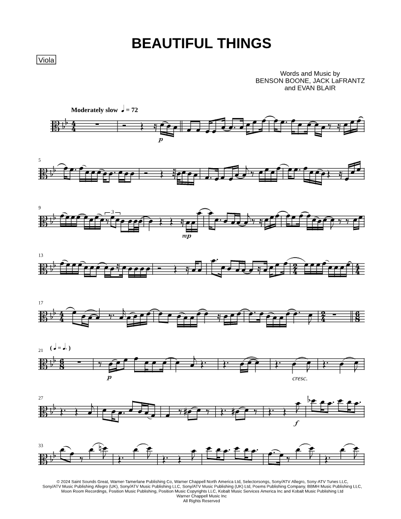 1. Beautiful Things - Viola (click here to preview and play this piece) Performer: Composers: Lyricists: Scored For:Instrumental Solo and Instrumental Part Instrument:Viola, range: F3-F5 Number of pages:2 Click here to purchase this piece separately for $3.99 |