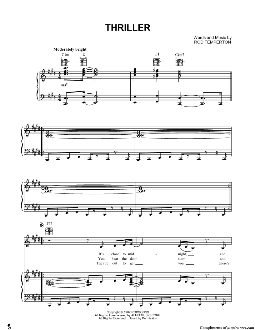 1. Thriller (click here to preview and play this piece) Performer: Composer: Lyricist: Scored For:Piano/Vocal/Guitar Instruments:Voice, range: G#3-F#5, Piano and Guitar Number of pages:11 Click here to purchase this piece separately for $5.99 |