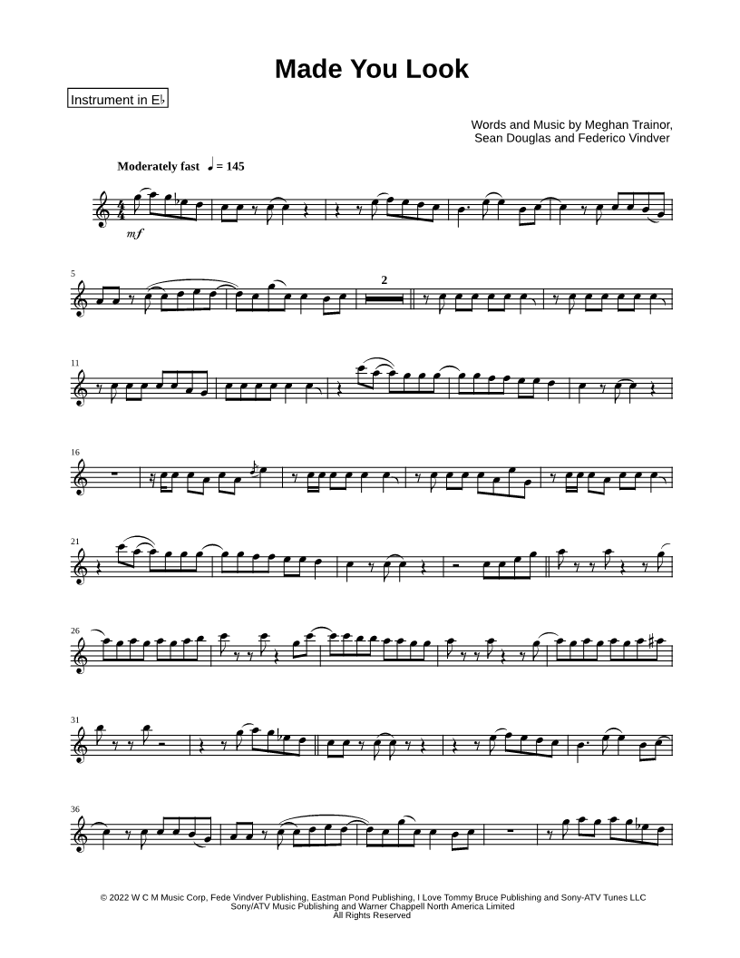 1. Made You Look - Eb Instrument (click here to preview and play this piece) Performer: Composers: Lyricists: Scored For:Instrumental Solo and Instrumental Part Instruments:Eb Instrument, range: G4-D6, Baritone Saxophone and Alto Saxophone Number of pages:2 Click here to purchase this piece separately for $4.99 |