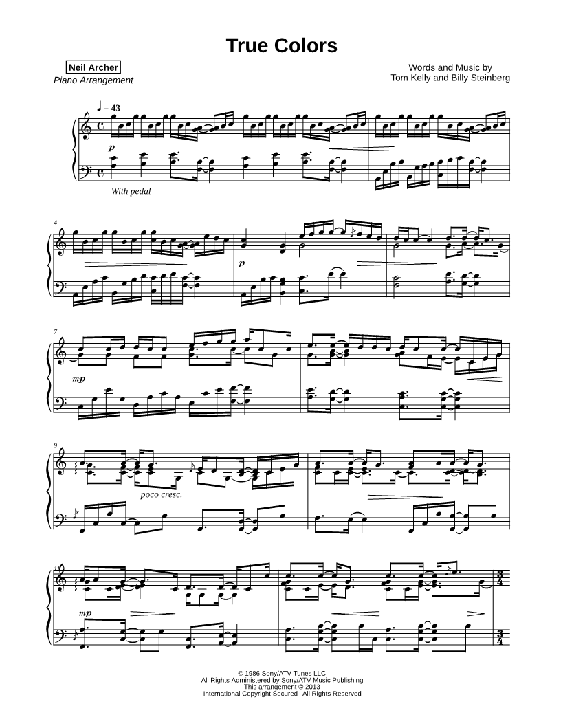 1. True Colors (click here to preview and play this piece) Performers: Composers: Lyricists: Scored For:Instrumental Solo Instrument:Piano Number of pages:4 Click here to purchase this piece separately for $9.99 |