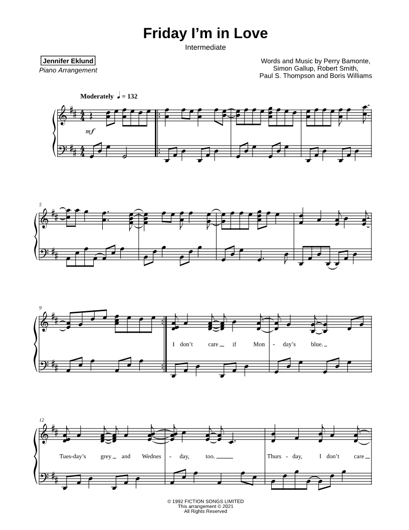 1. Friday I'm in Love [intermediate] (click here to preview and play this piece) Performers: Composers: Lyricist: Scored For:Instrumental Solo and Piano/Vocal Instrument:Piano Number of pages:7 Click here to purchase this piece separately for $5.79 |