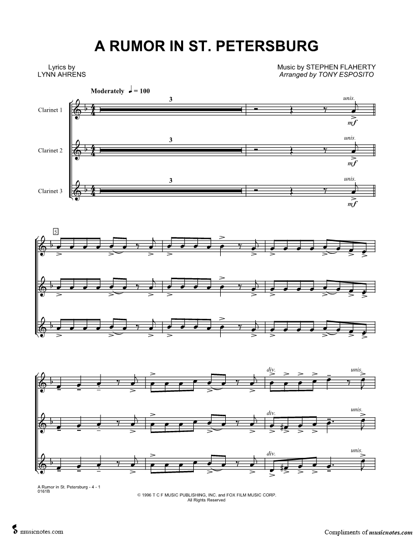 Anastasia Movie Selections --Solos/Duets/Trios for Clarinet |