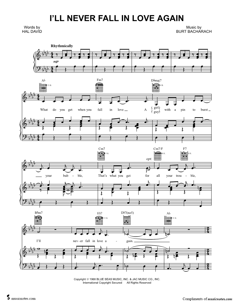 What do you get when you fall in love, A girl with a pin to burst your bubble, That's what you get for all your trouble, I'll never fall in love again. |