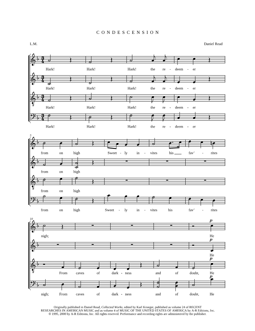 Hark! the redeemer from on high Sweetly invites his fav'rites high; From caves of darkness and of doubt, He gently speaks and calls them out. |