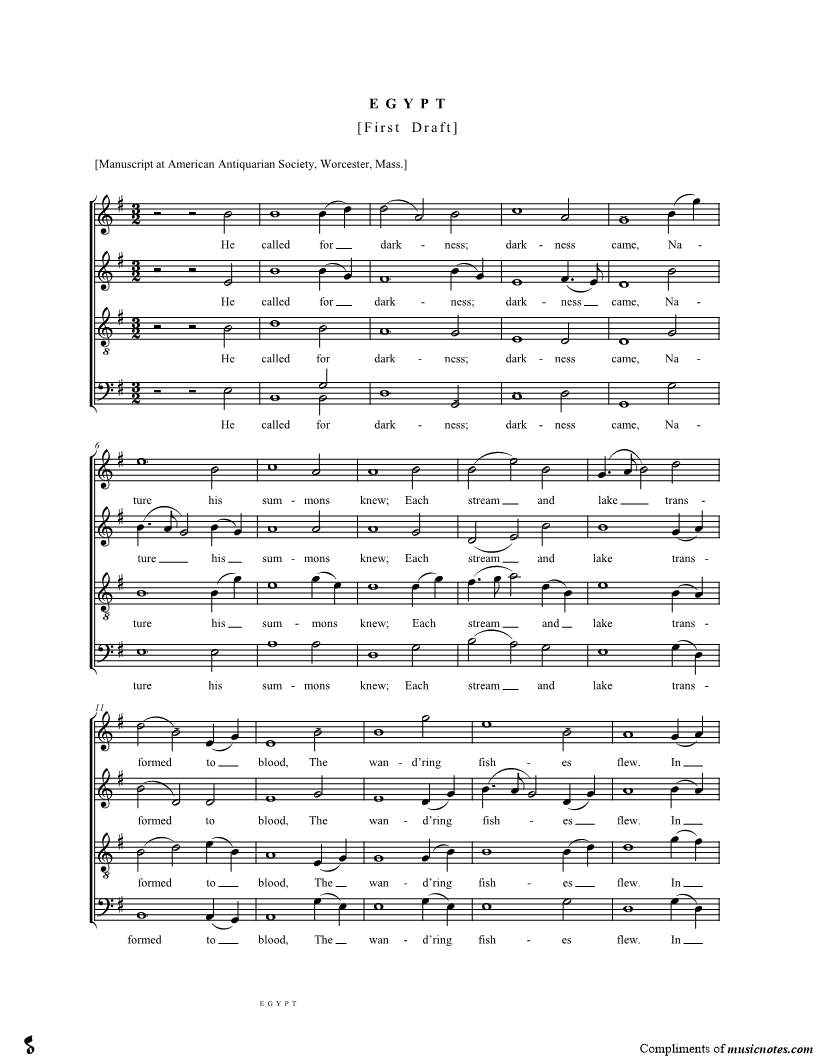 He called for darkness; darkness came, Nature his summons knew; Each stream and lake transformed to blood, The wand'ring fishes flew. |