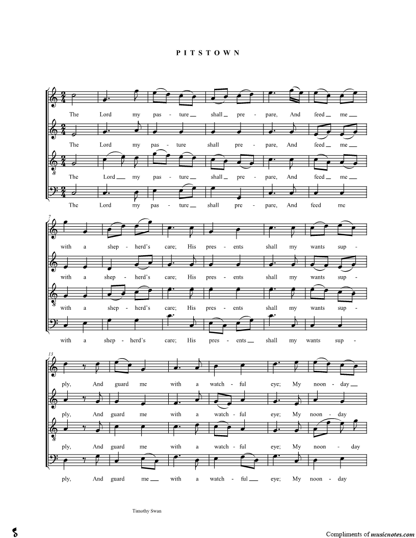 The Lord my pasture shall prepare, And feed me with a shepherd's care; His presents shall my wants supply, And guard me with a watchful eye; My noonday walk he shall attend, And all my midnight hours defend. |