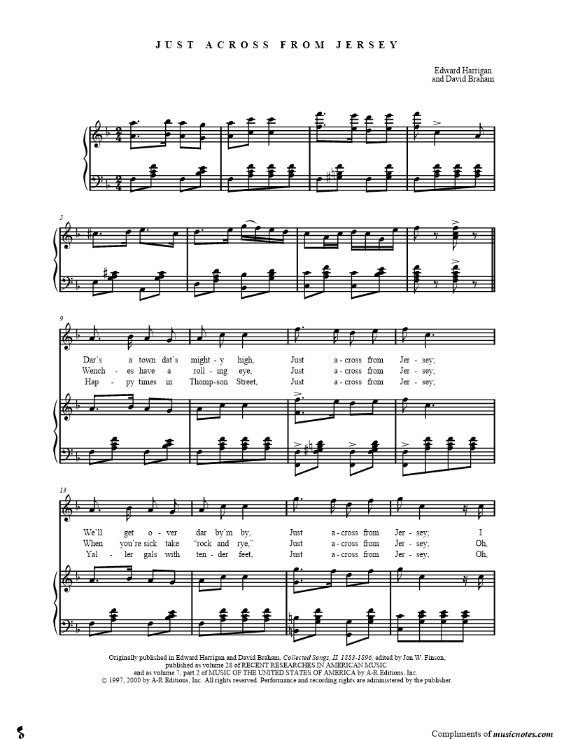 Dar's a town dat's mighty high, Just across from Jersey; We'll get over dar by'm by, Just across from Jersey; I bleve dey calls it old New York, Just across from Jersey; It's dar dese people gwine to talk, Just across from Jersey. |