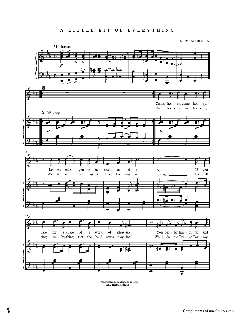 Come, honey, come, honey, Let me take you into swell society, If you care for a share of a world of pleasure, You better hurry up and come with me. |
