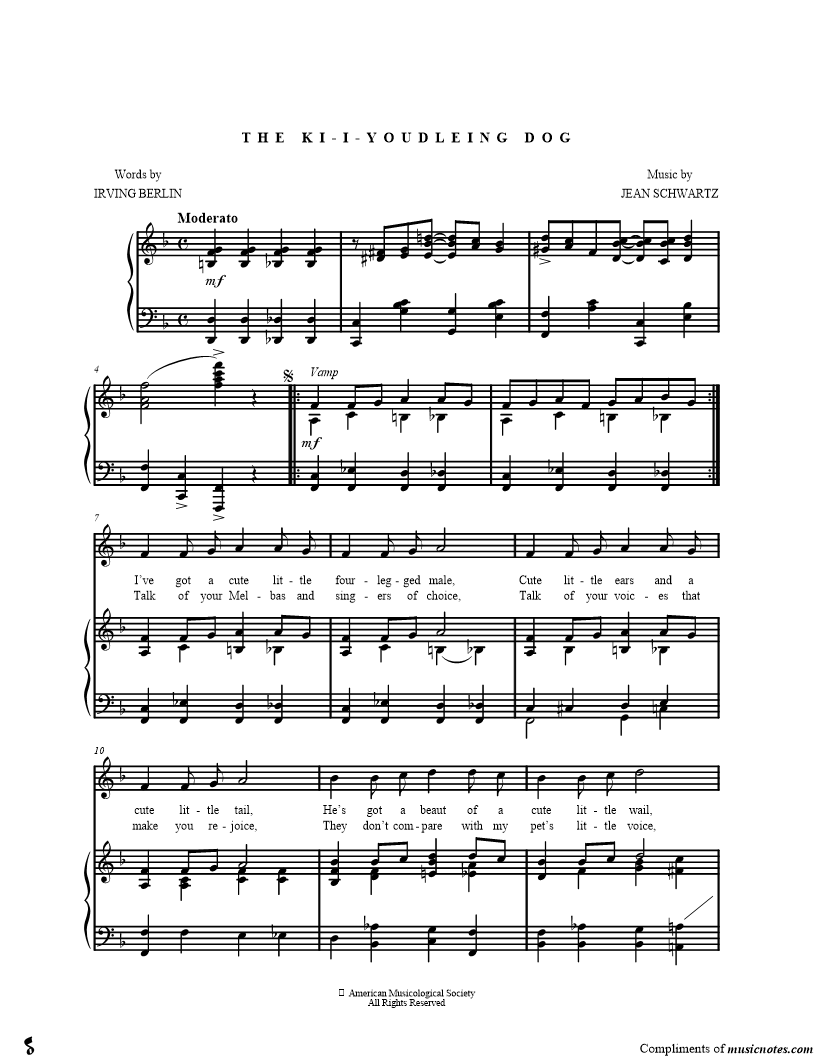 I've got a cute little four-legged male, Cute little ears and a cute little tail, He's got a beaut of a cute little wail, KiIYoudle that poodle Sings doggie words to a dog melody, Warbles "away" all the day willingly, |