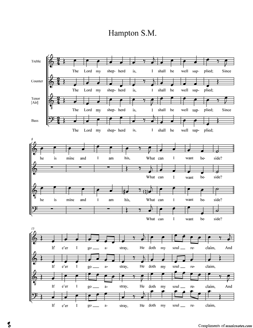 The Lord my shepherd is, I shall be well supplied; Since he is mine and I am his, What can I want beside? |