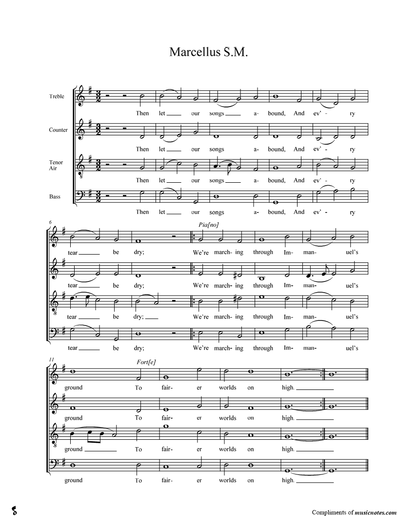 Then let our songs abound, And ev'ry tear be dry; We're marching through Immanuel's ground To fairer worlds on high. |