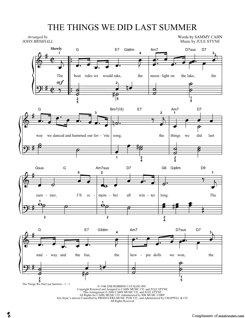 The boat rides we would take, the moonlight on the lake, the way we danced and hummed our fav'rite song, the things we did last summer, I'll remember all winter long. |