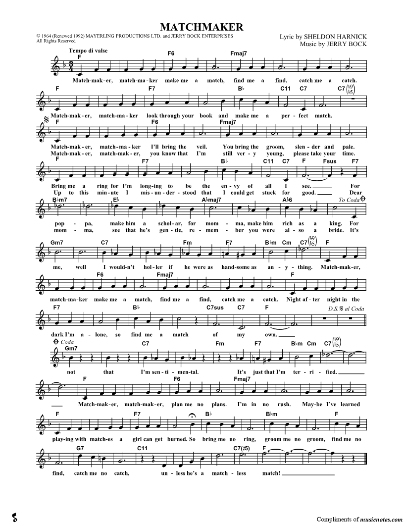 Matchmaker, matchmaker make me a match, find me a find, catch me a catch. |