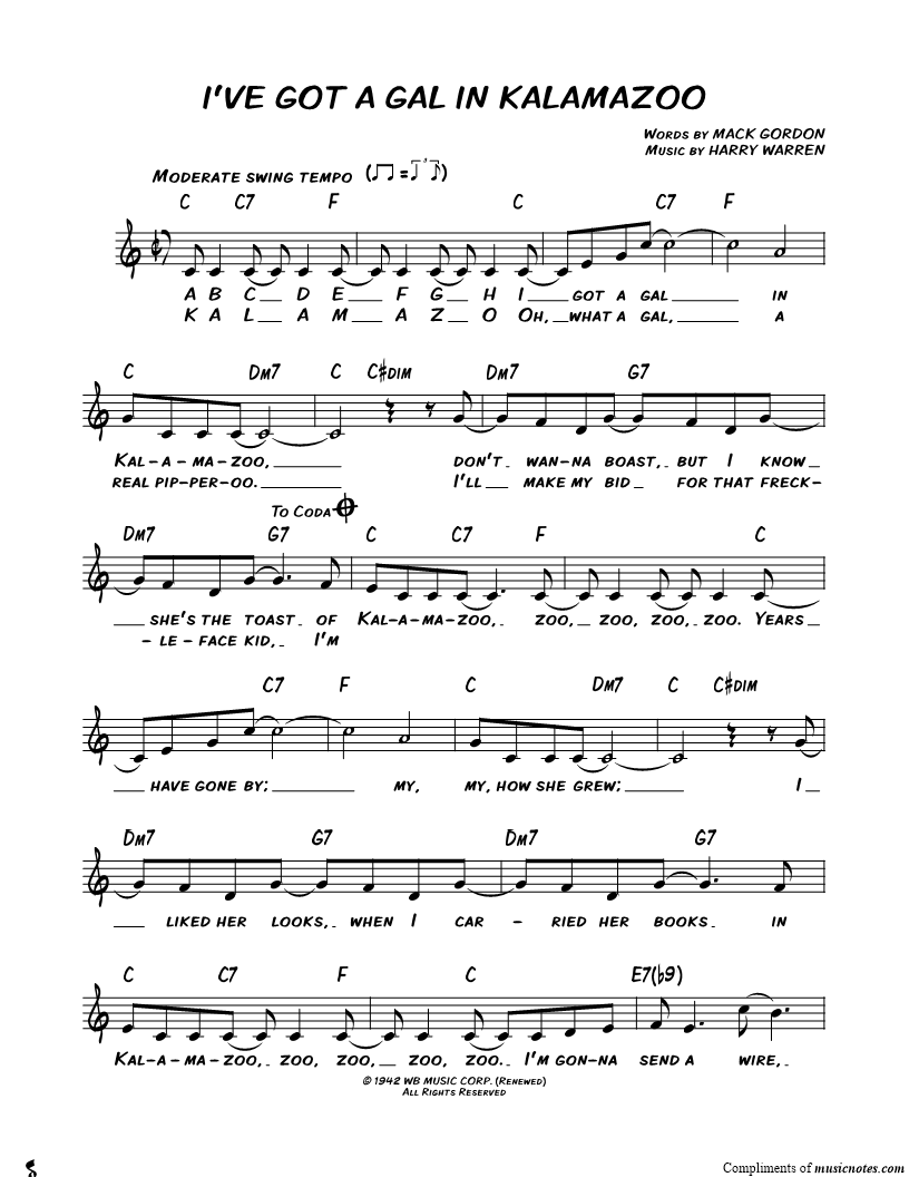 A B C D E F G H I got a gal in Kalamazoo, don't wanna boast, but I know she's the toast of Kalamazoo, zoo, zoo, zoo, zoo. |