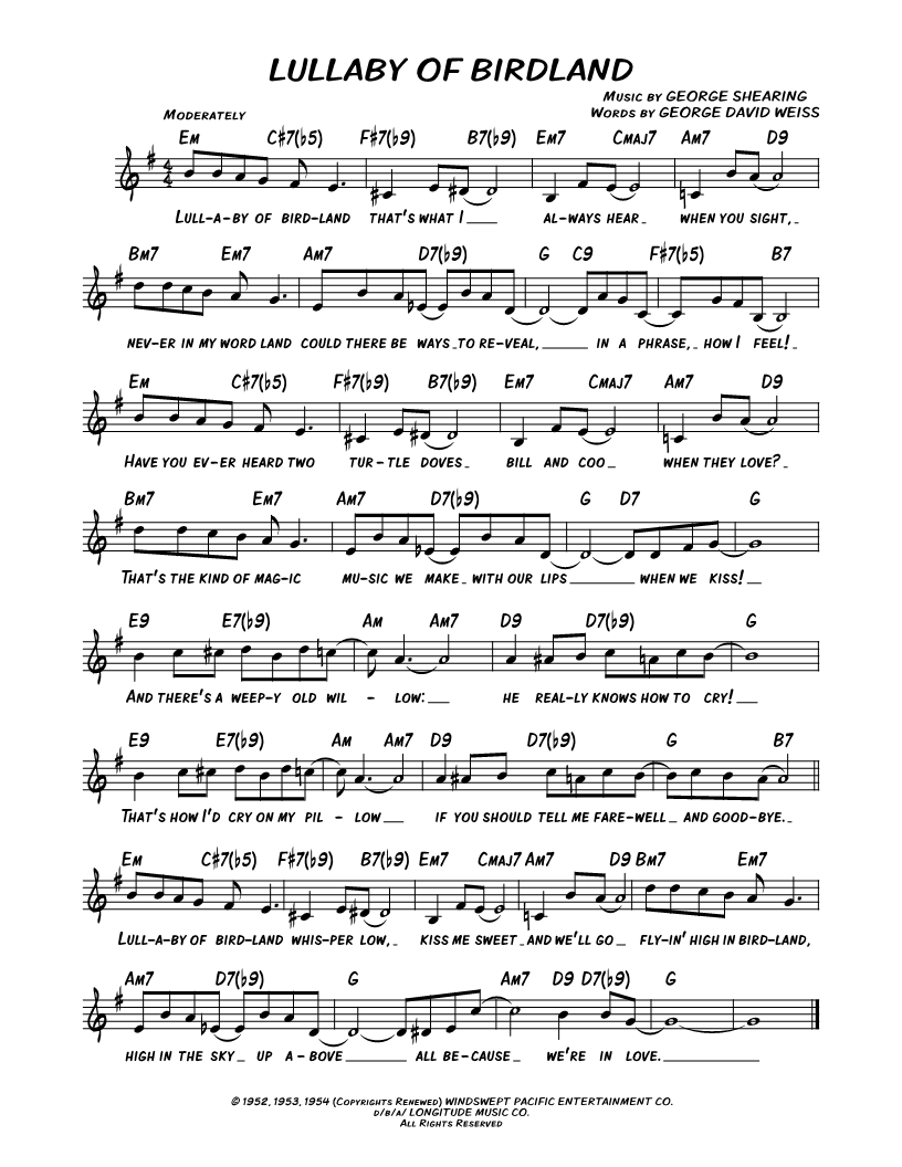 Lullaby of birdland that's what I always hear when you sigh, never in my word land could there be ways to reveal, in a phrase, how I feel! |