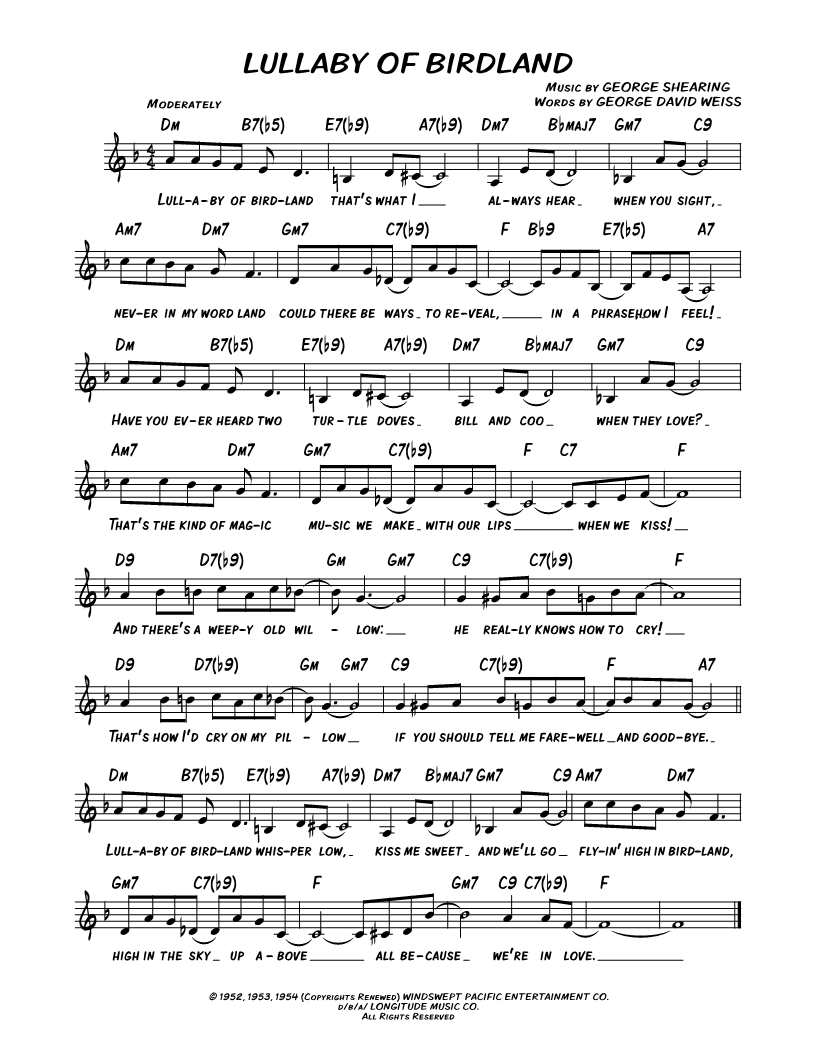 Lullaby of birdland that's what I always hear when you sigh, never in my word land could there be ways to reveal, in a phrase, how I feel! |