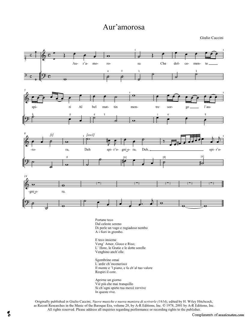 Aur'amorosa Che dolcemente spiri Al bel mattin mentre sorge l'aurora, Deh spir'ogni ora, Deh, spir'ogni ora. |