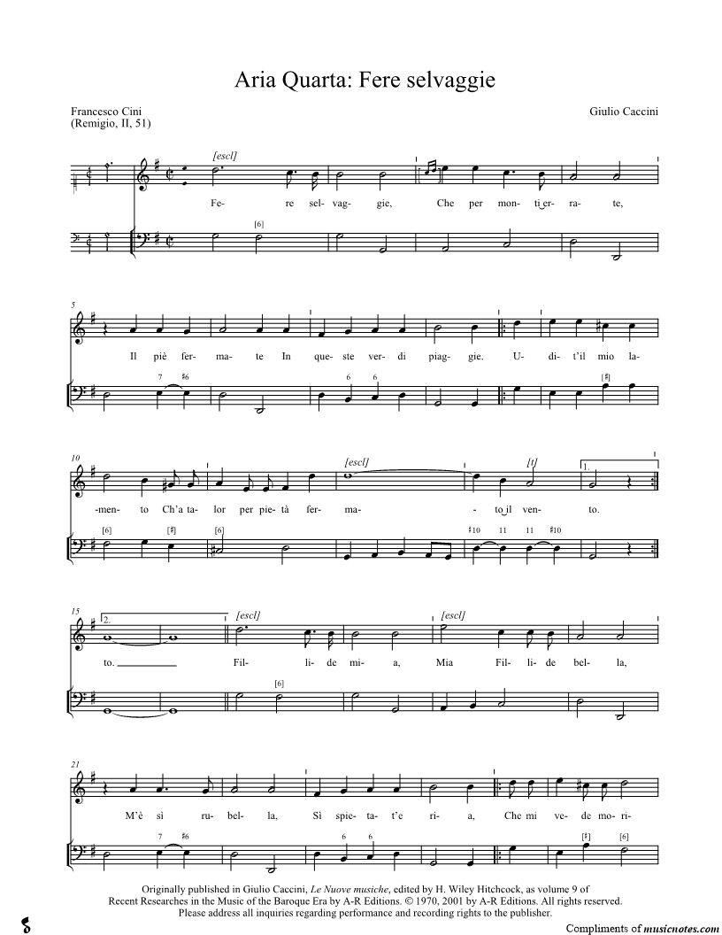 Fere selvaggie, Che per monti errate, Il piè fermate In queste verdi piaggie. |
