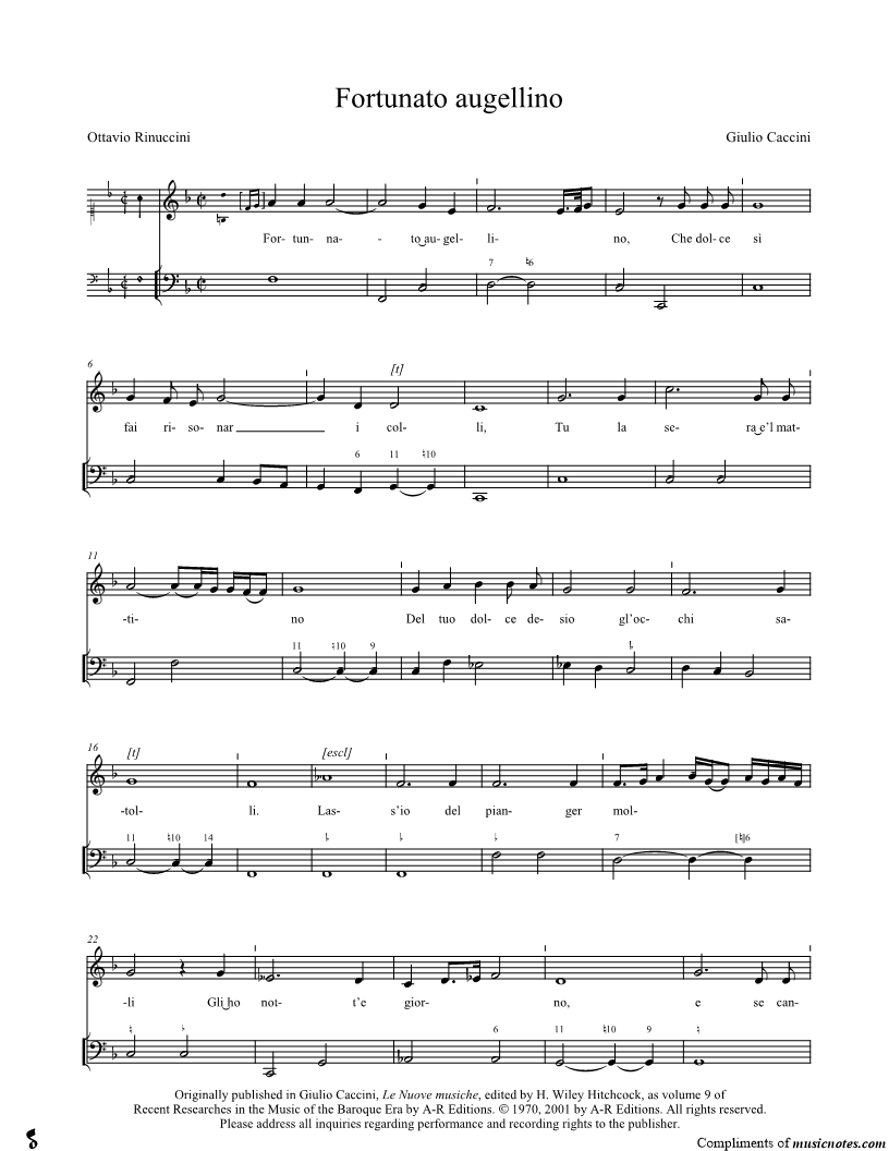 Fortunnato augellino, Che dolce sì fai risonar i colli, Tu la sera e'l mattino Del tuo dolce desio gl'occhi satolli. |