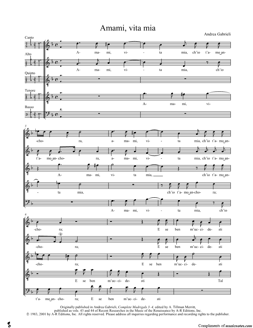 Amami, vita mia, ch'io t'amo anchora; E se ben m'uccidesti Tal gratia anco me festi Ch'io viva in te, s'in me par ben ch'io mora. |