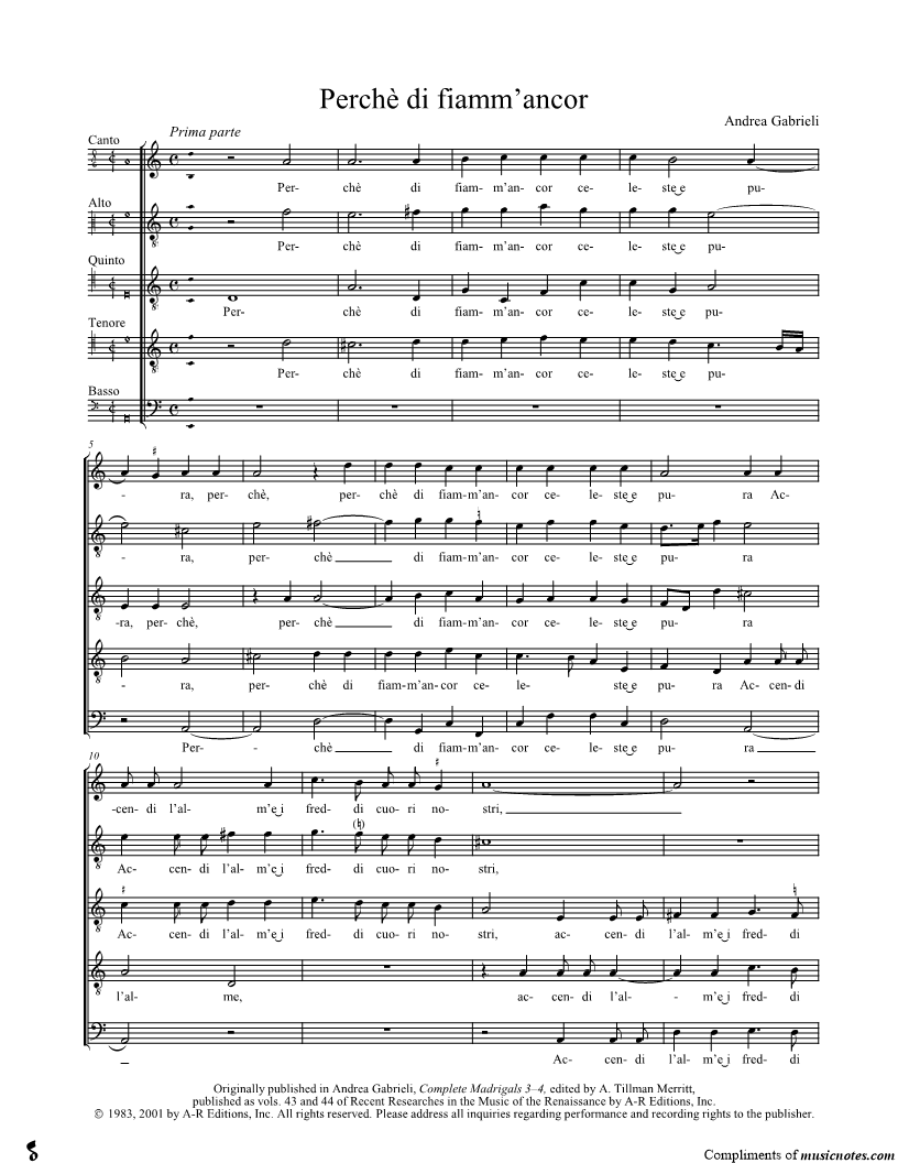 Alto Voice, range: D3-A4 Canto, range: B3-D5 Basso, range: E2-A3 Quinto, range: C3-F4 Tenore, range: C3-F4 Choir | |