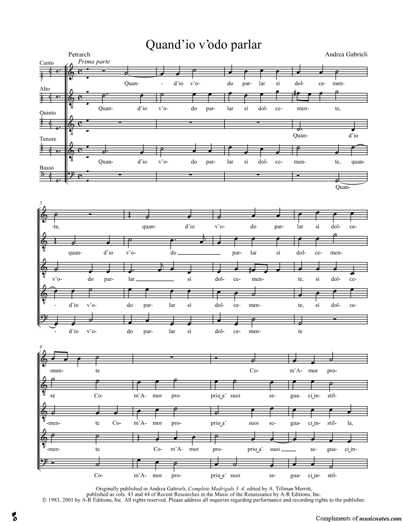 Canto, range: D4-D5 Tenore, range: C3-E4 Alto Voice, range: D3-G4 Quinto, range: C3-E4 Basso, range: G2-A3 Choir | |