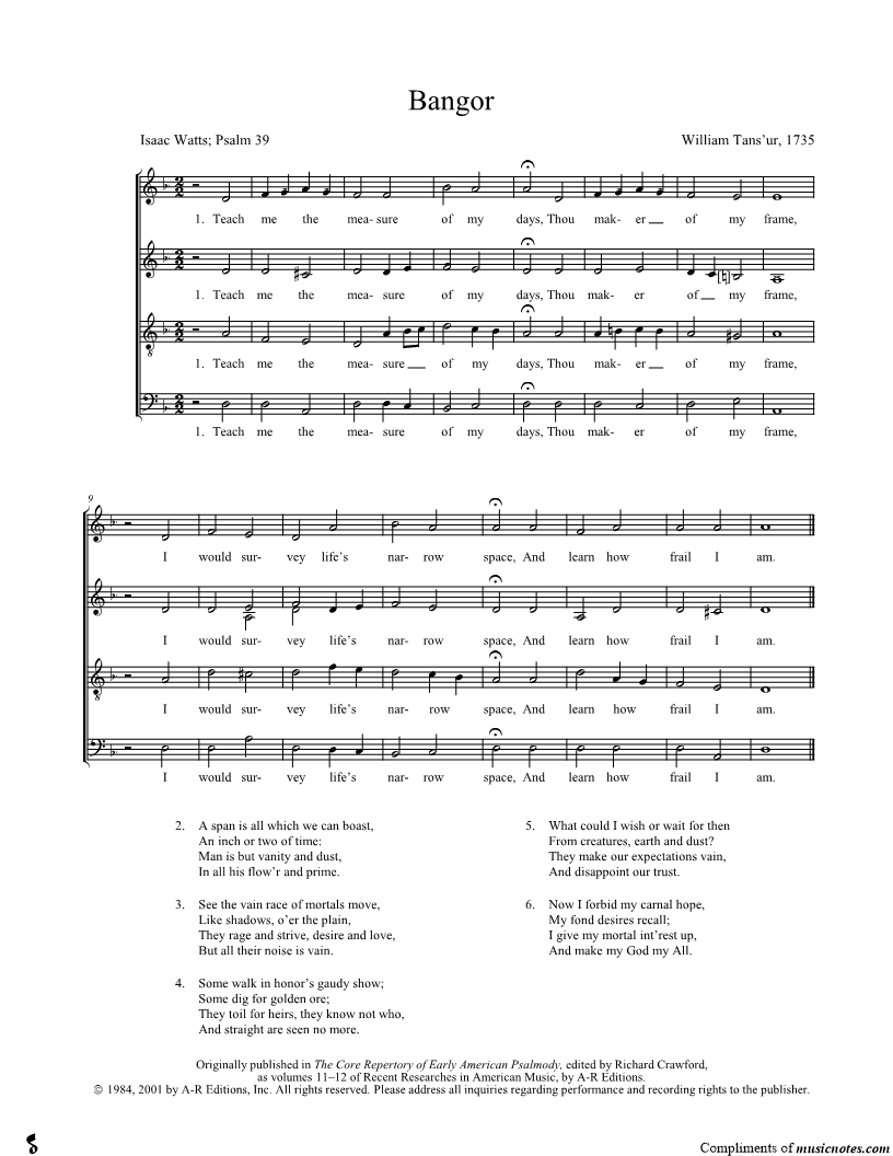 Teach me the measure of my days, Thou maker of my frame, I would survey life's narrow space, And learn how frail I am. |