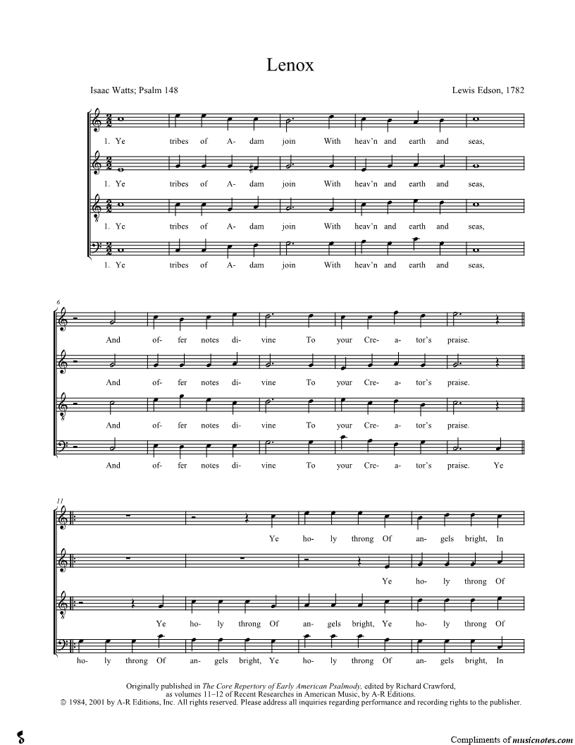 Ye tribes of Adam join With heav'n and earth and seas, And offer notes divine To your Creator's praise. |