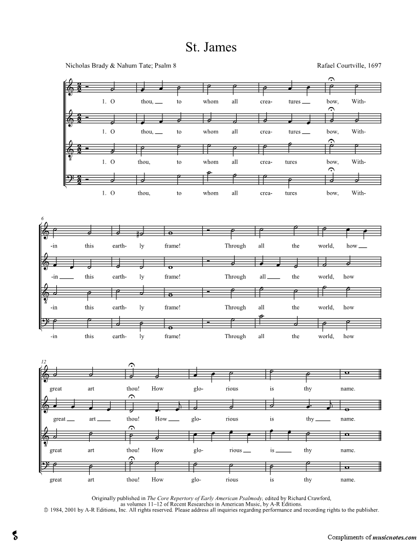 O thou, to whom all creatures bow, Within this earthly frame! Through all the world how great art thou! How glorious is thy name! |