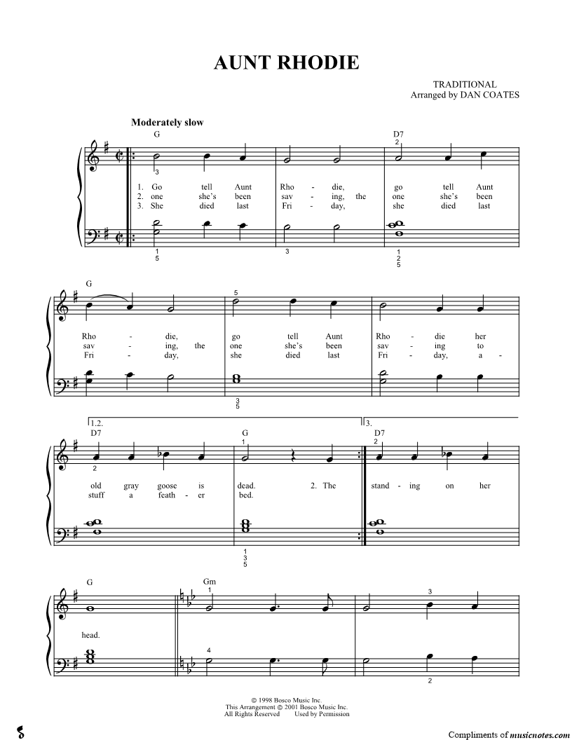 Go tell Aunt Rhodie, go tell Aunt Rhodie, go tell Aunt Rhodie her old gray goose is dead. |