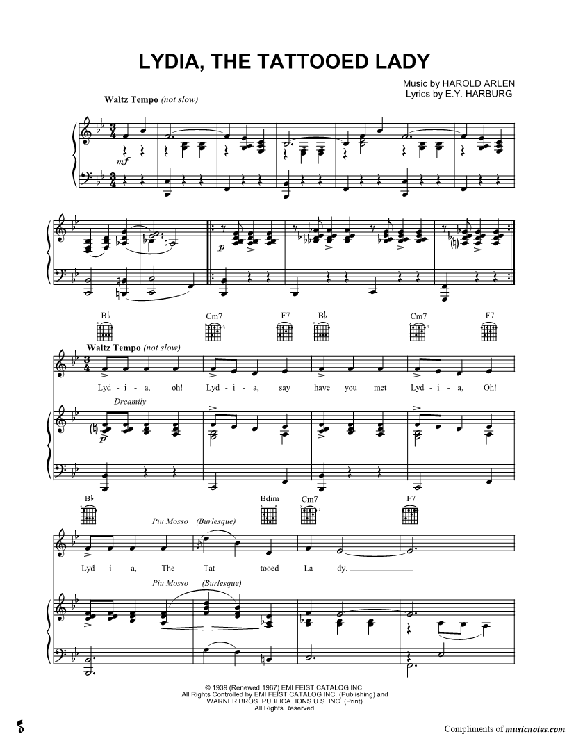 Lydia, oh! Lydia - say have you seen Lydia? Lydia, the Tattooed Lady. She has eyes that folks adore so. And a torso, even more so. Lydia oh Lydia, that encyclopedia - Oh! Lydia the Queen of Tattoo. On her back is the battle of Waterloo, beside it the wreck of the Hesperus too, And proudly above waves the red white and blue - you can learn a lot from Lydia! (Whistle) |