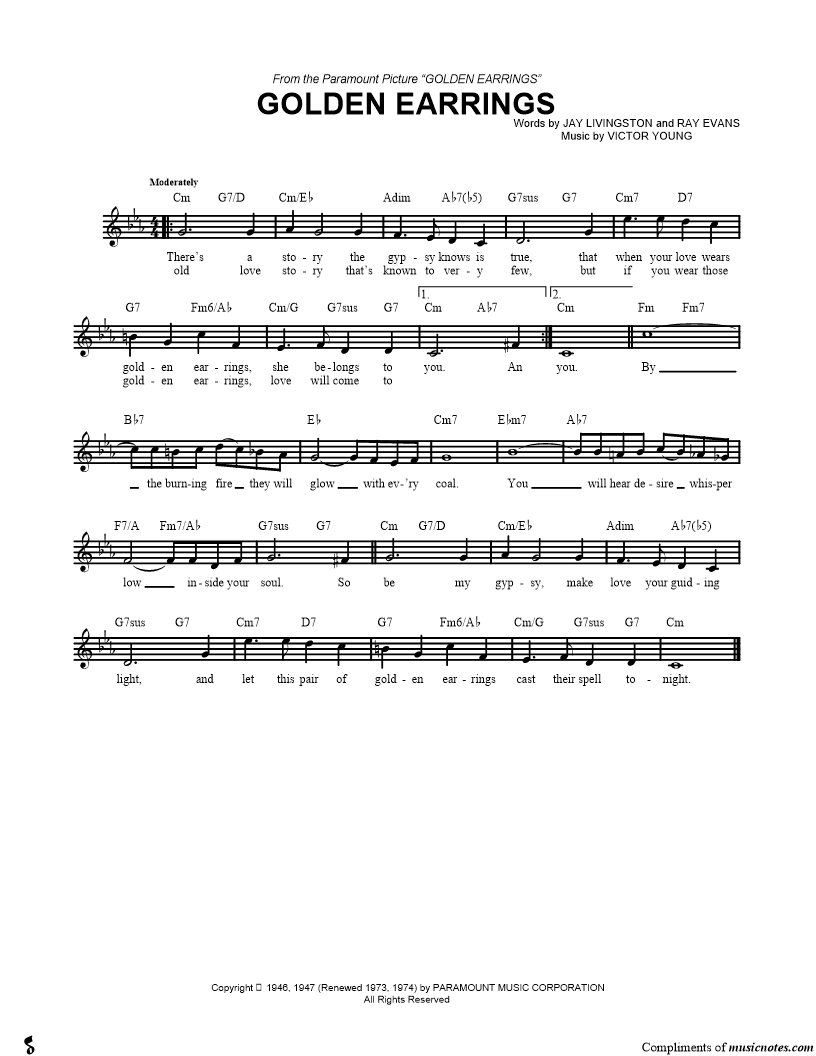 There's a story the gypsy knows is true, that when your love wears golden earrings, she belongs to you. |