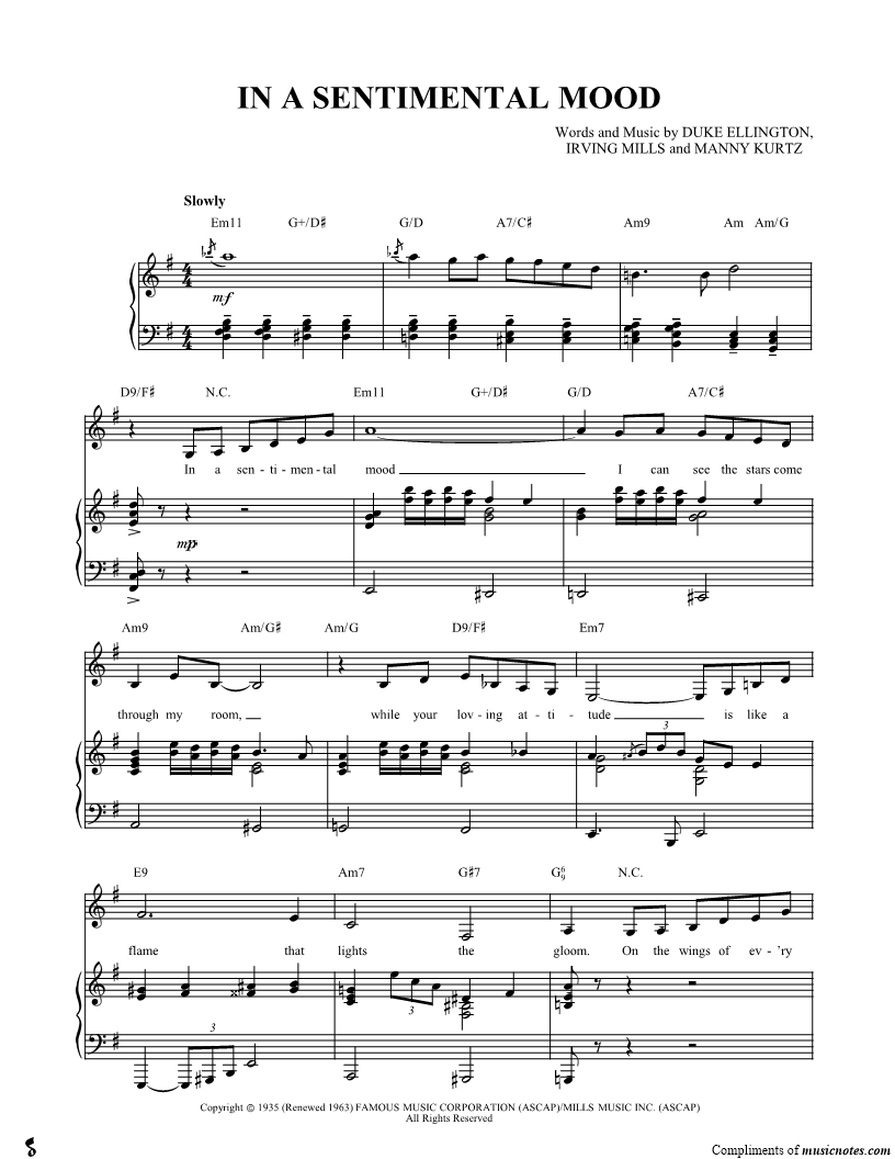 In a sentimental mood I can see the stars come through my room, while your loving attitude is like a flame that lights the gloom. |