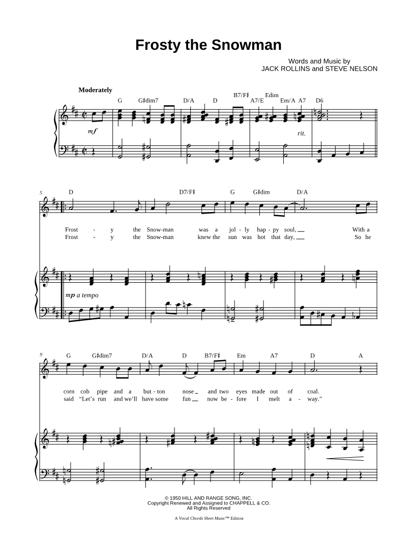 Frosty the Snowman was a jolly happy soul, |